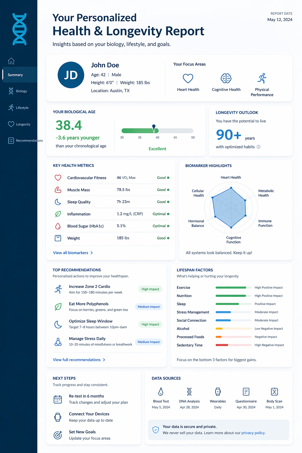 Assess → Plan → Train → Optimize Detailed planning and customized reporting that can be tracked based on many areas including personal blood work, hormone levels, past health issues, injuries, DNA data, biometrics, sleep, fitness, nutrition, etc.